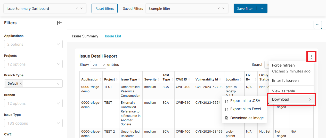 Note: To include DAST test results, the Display Default Branch filter must be set to Include all (default) or true.