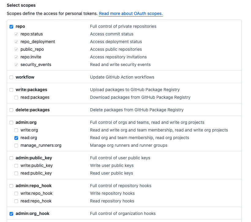 admin:org), and admin:org_hook if planning on using SCM Integration