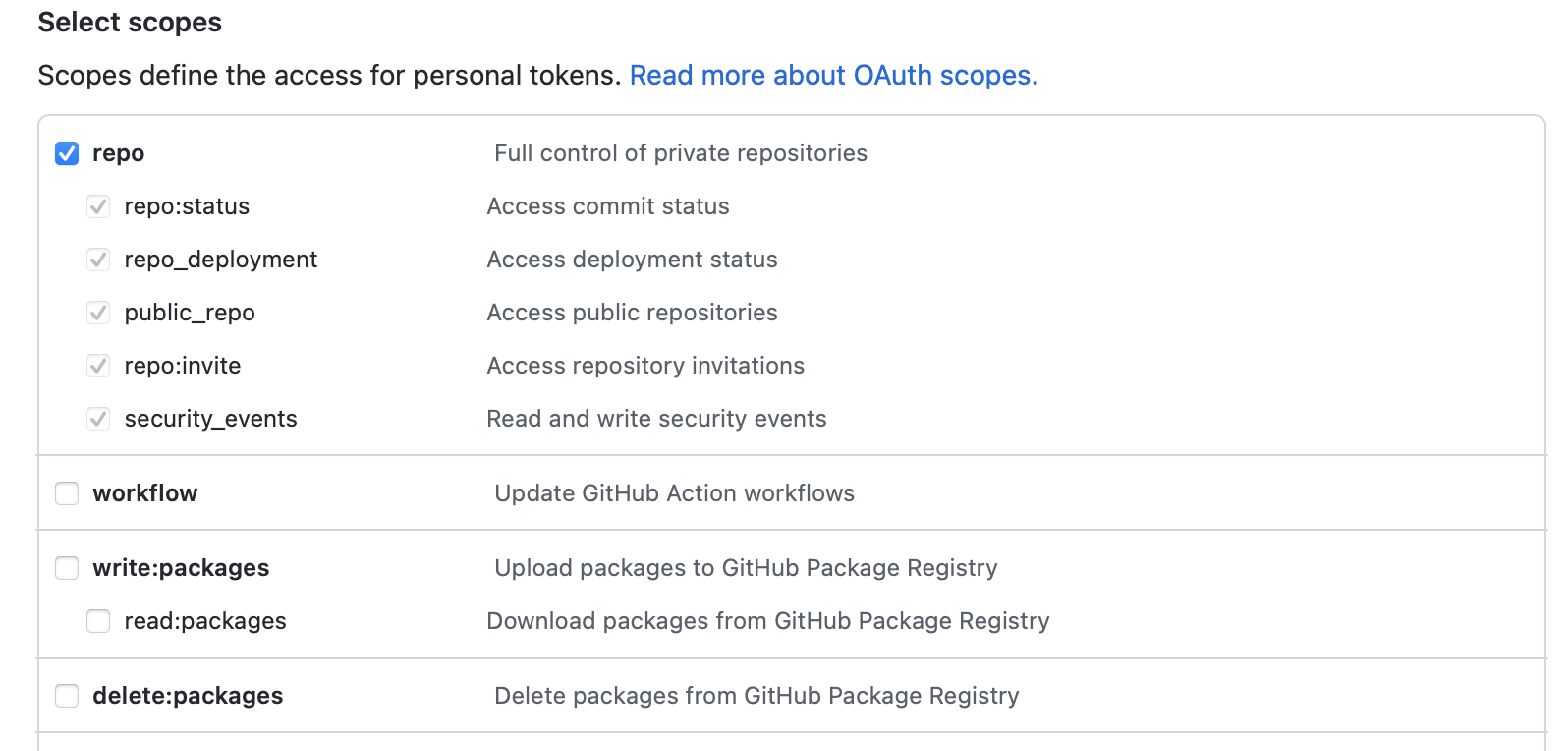 Important: To use the event-based test automation feature or synchronize the repository with Polaris, the GitHub personal access token (classic) that you use for the integration (created by a GitHub Organization Owner) requires the additional scopes: read:org (under admin:org), and admin:org_hook. See GitHub Personal Access Token Requirements for SCM Integration Monitoring for more information.Note: For more information on creating access tokens, see the GitHub documentation. - Set the token's expiration date. To avoid issues, we recommend