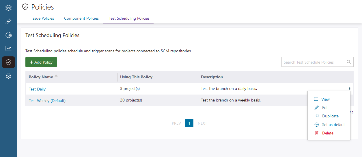 Important: If you assign a test scheduling policy to a project or branch that isn't connected to an SCM repository, it will not function as expected. Before you use test scheduling policies, set up an SCM integration, and import branches from your repository. For more information, see Integrate a SCM Repository to a Project and Create and manage branches in a project.